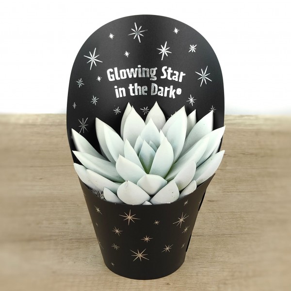 Planta crassa o suculenta originària del continent americà, és una echeveria de fulles gruixudes i tendres, amb les puntes pintades de color rosa amb pintura especial per a plantes que els permet fer la fotosintesi perfectament. Echeveria que brilla a la foscor de color groc gràcies a la seva pintura fluorescent.