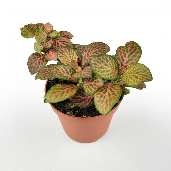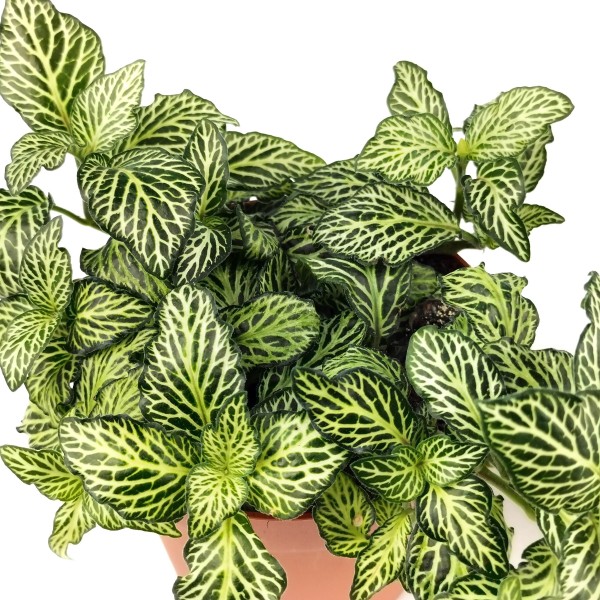 Fitonnia verschaffeltii. La fittonia és una planta interior que forma una mata compacta de fulles verdes, o roses, o blanques amb uns nervis molt ramificats i de color clar. Planta de port petitó és ideal per a composicions o decorar espais petits.