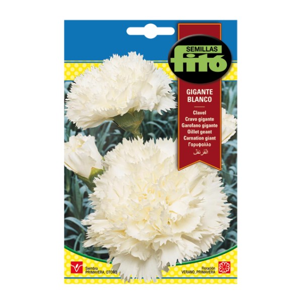 Dianthus caryophyllus. Planta vivaç caracteritzada per les seves vistoses flors de color blanc. Ideal per a testos i jardineres i per a flor tallada.