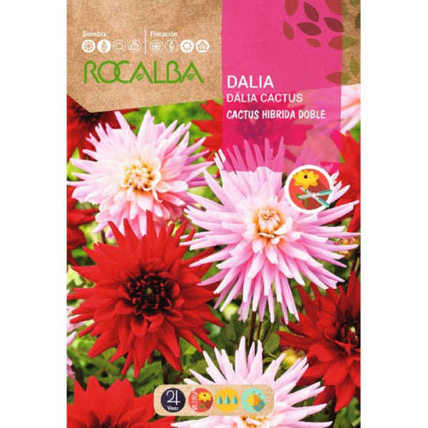 Llavor de dàlia cactus doble híbrida variada (Dahlia variabilis). Planta herbàcia tuberosa perenne de fulles compostes i flors reunides en capgrossos força grans i de lluminosos colors. S'utilitzen en formació de massissos i com a flor tallada.