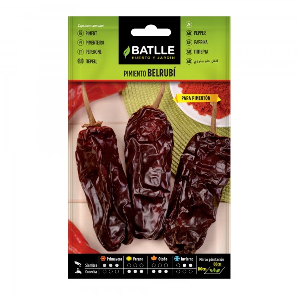 Llavor de pebrot Belrubí de varietat per a pebre vermell lleugerament picant, de 11×13 cm. per 2,5×3 cm. Apte per a elaboració de pasta o concentrats.