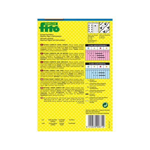 Petunia hybrida compacta nana. Planta anual destacable per les seves nombroses flors de llarga durada, compactes i de mida mitjana. De cicle anual.