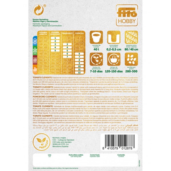 La llavor de tomàquet Clemente F1 de Semillas Fito és una varietat híbrida de tomàquet per a amanida, de vigor mesurat amb entrenusos curts. Ramillets compostos de 5-6 fruits amb un raquis gruixut i carnós que permet mantenir-los en postcollita amb frescor durant molt de temps.
