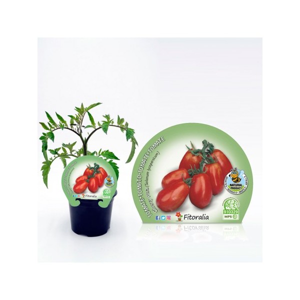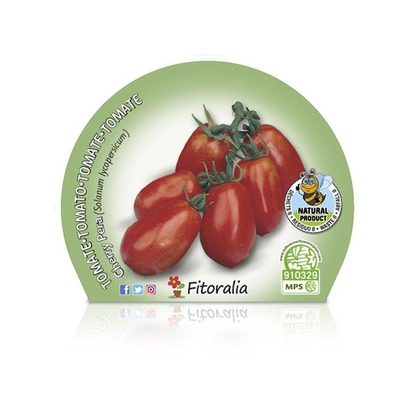 Planta de tomàquet cherry en forma de pera de color vermell, presentat en test de 10,5 cm de diàmetre.