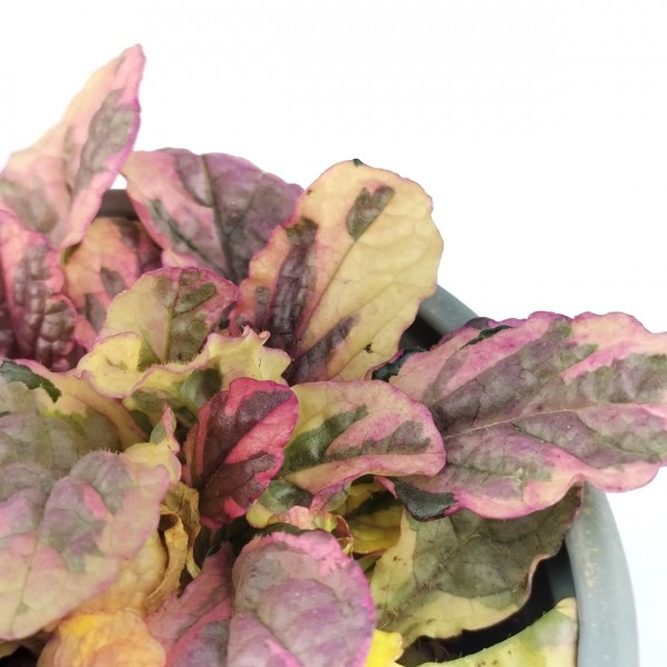 Planta rastrera i entapissant, l'ajuga de fulla matisada és una planta molt similar a l'ajuga reptans morada, però les fulles comparteixen el morat característic amb colors verds i groguencs. És un gran substitut de les gespes tradicionals per a zones d'ombra i fresques: