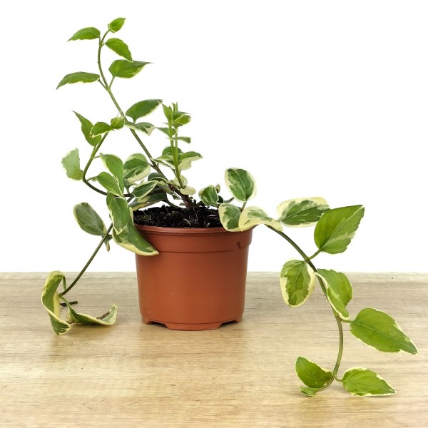 La vinca minor matisada és una planta entapissant de fulles rodones i matisades de verd blanc amb floració estiuenca espectacular. Molt vivaç, colonitza fàcilment parterres i espais assolellats o fins i tot en sol ombra, cobrint perfectament el terra amb una mata del voltant 10 cm d'alçada.