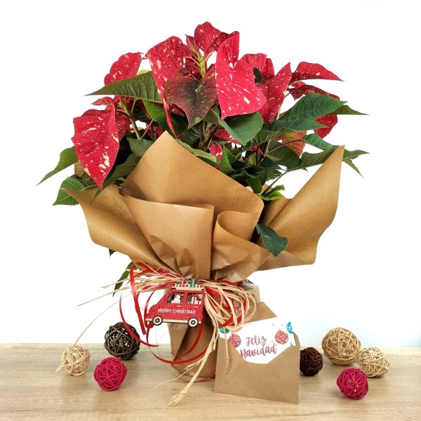 La flor de Nadal de color vermell xispejat és una ponsètia de la mateixa mida, port i cura que la ponsetia tradicional però de color vermell clar variegada en color crema. Una proposta diferent per a aquest Nadal.
