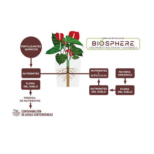 Para completar la eficiencia de la mezcla añadimos nuestros exclusivos ingredientes NITROSPHERE con efecto Probiótico de Algas (Ascophyllum Nodosum) y el efecto Prebiótico de flora natural del suelo que permiten mantener disponibles los nutrientes esenciales de las plantas: Nitrógeno (N), Fósforo (P) y Potasio (K).