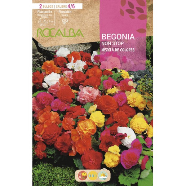 Bulbo de begonia non stop, de plantación en invierno - primavera en colores variados. Begonia de floración abundante en colores variados durante todo el período cálido. Prefiere un lugar con mucha luz en el exterior pero no con sol directo.