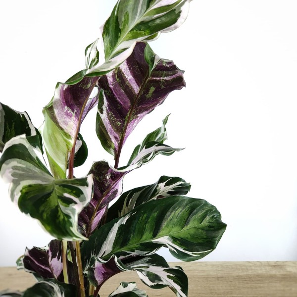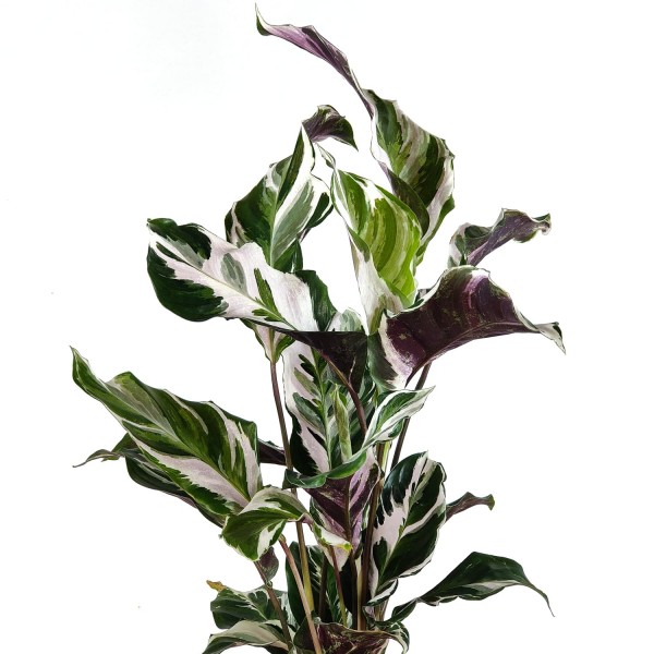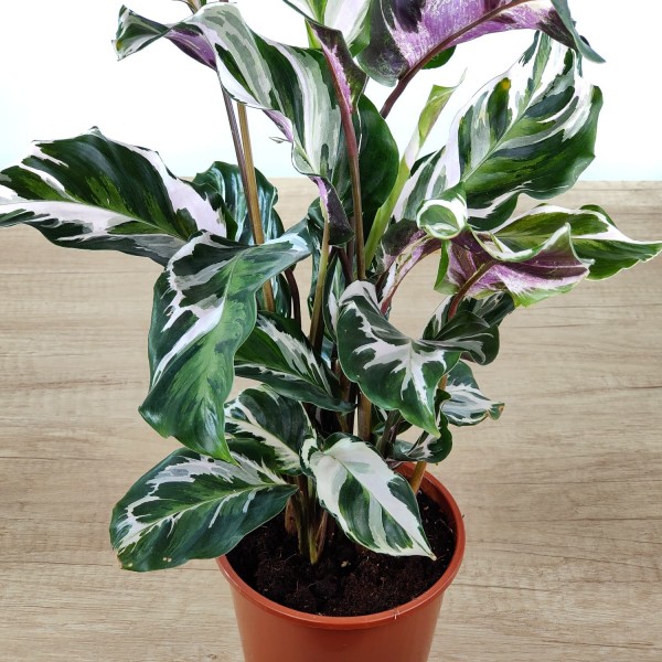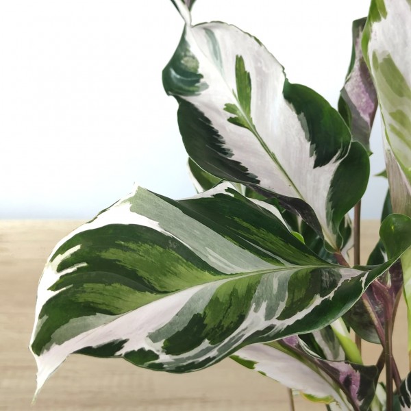 La Calathea Fusion White es una planta de interior excepcionalmente decorativa por la espectacularidad del color de sus hojas y su porte tupido, con muchas hojas apiñadas y alargadas. Hojas matizadas con verde de muchas tonalidades y blanco puro en el amberso, con un toque liloso en en amberso. Parece de dibujos animados!
