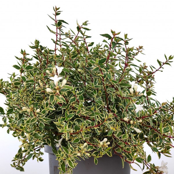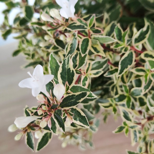 La abelia grandiflora Kaleidoscope, es un arbusto de hoja matizada, con los bordes cada vez más blancos a medida que avanza el otoño. Hojas redonditas y delicadas, de euna gama de verdes y blancos espectacular. Es semi-perenne, ya que en inviernos de clima frío puede perderlas.