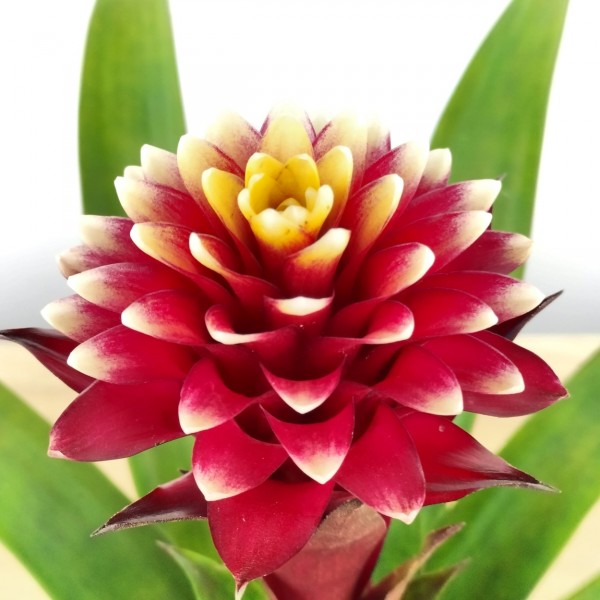 La guzmania Francesca es una bromelia de flor espectacular y muy diferente, de flor redonda con pétalos anchos y distribuidos de forma perfectamente uniflorme por toda la flor. Los pétalos son de un rojo y amarillo espactacular. Es una planta de interior, fantástica para decorar cualquier espacio del hogar, por sus hojas verdes en forma de cinta que nacen del tallo erecto, con la flor espectacular, super duradera y perfecta.