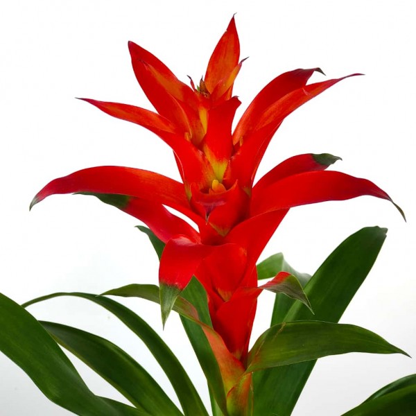La guzmania de flor larga es una planta de interior, fantástica para decorar cualquier espacio del hogar, por sus hojas verdes en forma de cinta que nacen del tallo erecto, con flor todo el año, en colores variados, desde amarillos, naranjas o rojizos.