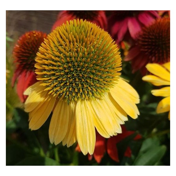 Esta echinacea ornamental, originaria de America del norte, es una planta veraniega, de floracion en forma de margarita, en colores variados de muchas tonalidades. Es una planta vivaz, que puede renacer cada primavera (la parte aerea muere con el frío) y resiste condiciones de sol directo y clima caluroso. Crea tallos largos con sus grandes y espectaculares flores.