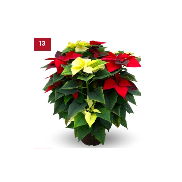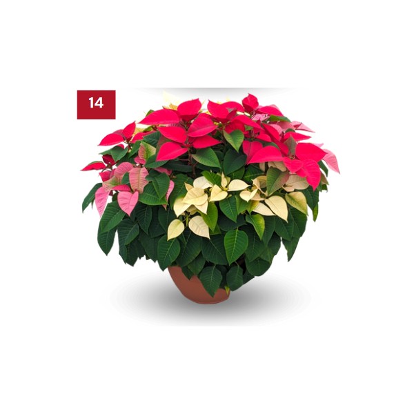 Te proponemos una flor de pascua más grande que la medida tradicional, de 2 o 3 colores diferentes en la misma maceta, una planta alta, ancha y tupida. Esta flor de Pascua es una combinación de plantas de colores diferentes y pero de medida grande, para decorar grandes espacios