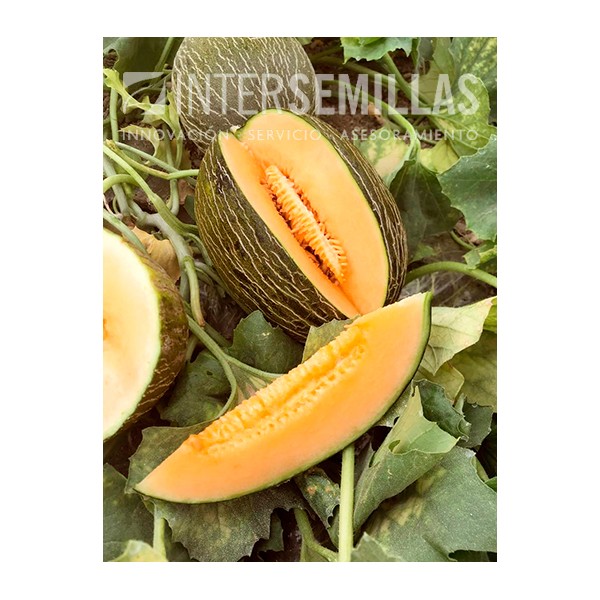 La semilla de melón Sorolla F1 de Intersemillas. Es una variedad híbrida de melón de tipo Piel de sapo carne naranja.