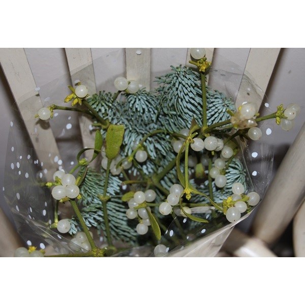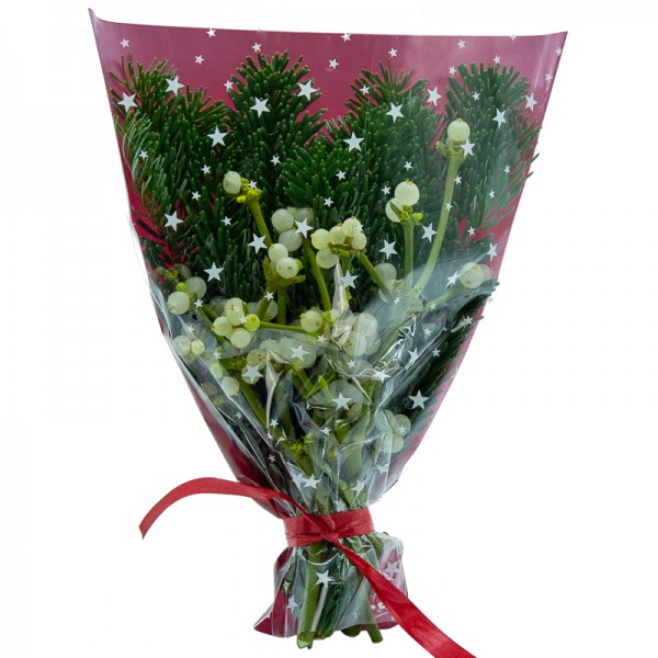 Ramo de muérdago de la suerte, hecho con papel de celofán, ramas de abeto y muérdago.