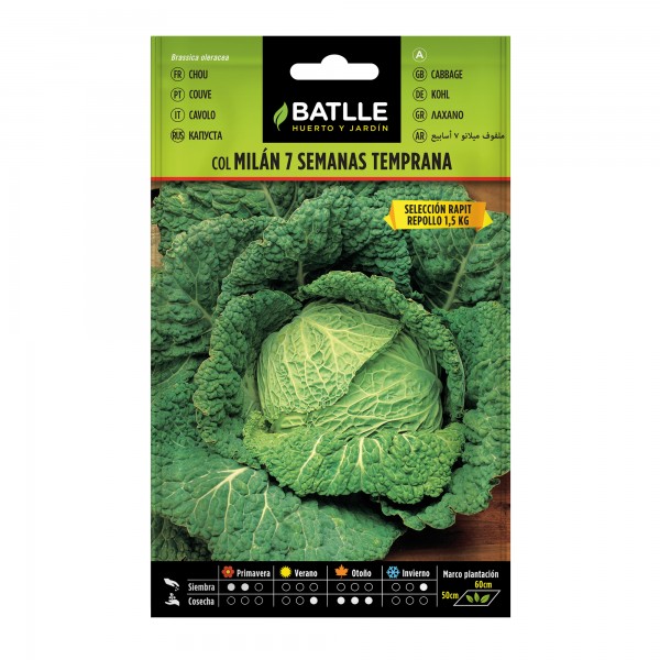 Variedad de semilla de col Milan muy precoz de pie corto, hojas rugosas yrepollo redondeado.