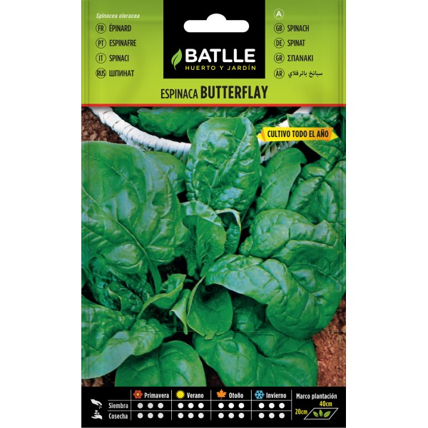 La semilla de espinaca Butterfly, de hojas grandes y carnosas de forma oval, resistente subida de flor. Idónea para fresco y congelado.