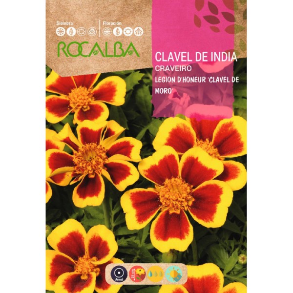 Semilla de clavel de la india (tagetes patula). Planta anual muy vigorosa y resistente, de hojas divididas y flores pedunculadas en cabezuela terminal de color amarillo con manchas centrales bronceadas. Tiene una prolongada floración. Indicada en terrazas, jardineras, macetas y en macizos.