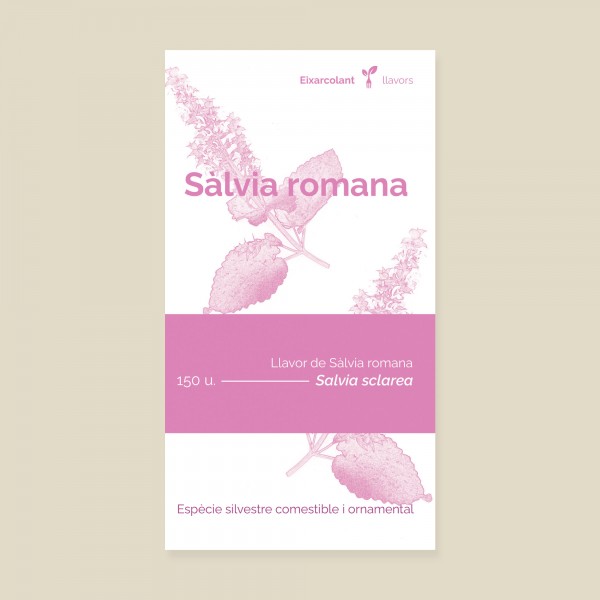 La semilla de Salvia sclarea o salvia romana es una especie perenne muy aromática, melífera y vistosa, de la familia de las labiadas que se seca después de la floración y fructificación, pero vuelve a rebrotar, pudiendo alcanzar una altura de 120 cm. Las inflorescencias presentan un aspecto rosa pálido muy vistoso gracias a la presencia de unas brácteas de color similar a la flor. Se consumen tanto sus hojas como sus flores.