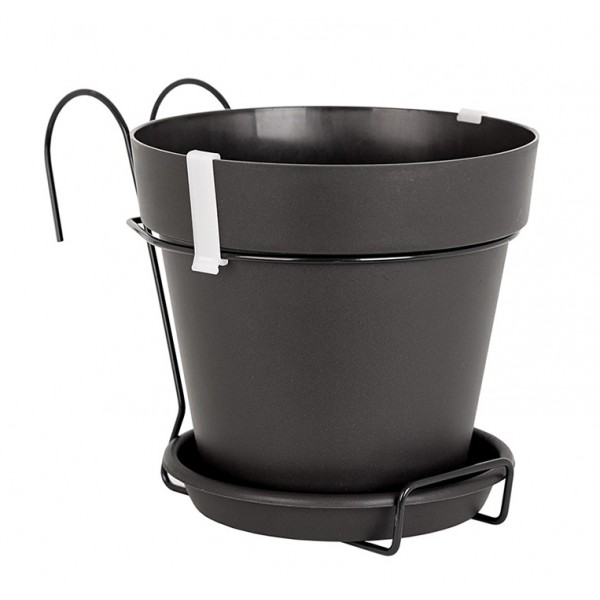Il est équipé d'un mécanisme métallique permettant de maintenir le pot sur la balustrade du balcon. Il comprend une assiette pour recueillir l'excès d'eau.