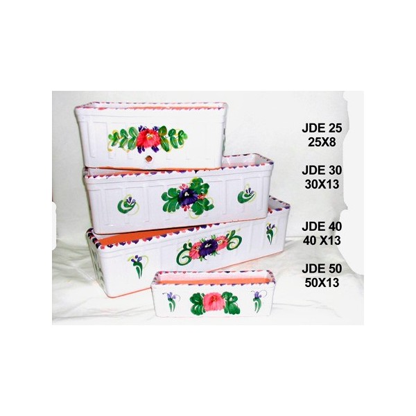Jardinière rectangulaire en terre cuite lisse et décorée dans le style andalou. Très résistant au froid et à la chaleur, il est idéal aussi bien pour l'intérieur que pour l'extérieur. Peint avec des peintures de première qualité, très résistantes et de très longue durée. Idéal pour les fenêtres et les projections en raison de sa robustesse et de son équilibre.