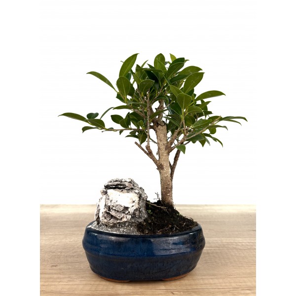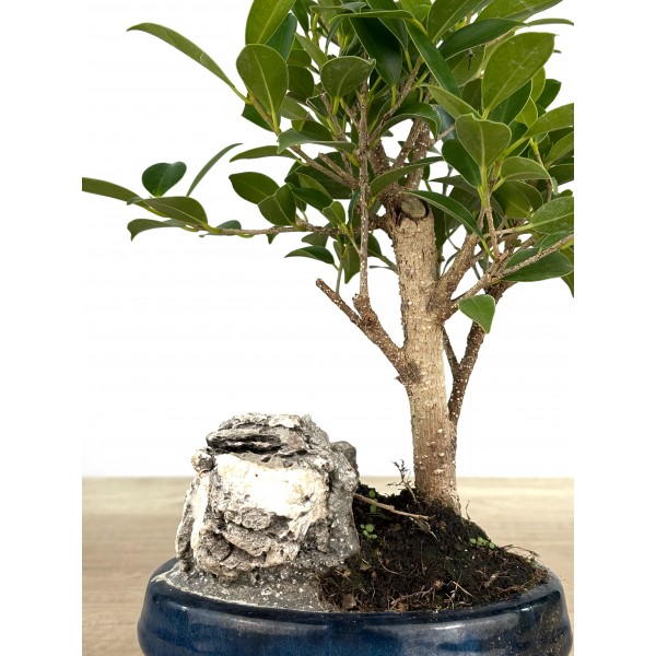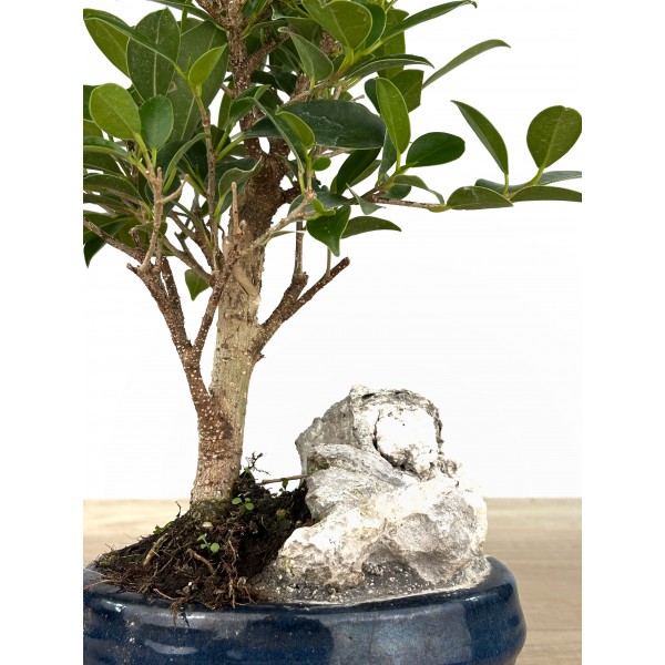 Ce ficus bonsaï de 6 ans, cultivé dans un pot en pierre, est un exemple typique de la technique japonaise du bonsaï, ce qui lui confère une beauté unique. Un bonsaï vraiment exceptionnel.
