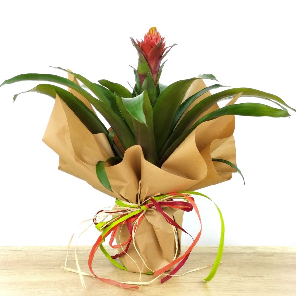 Vous souhaitez recevoir votre Guzmania Punta emballé dans un cadeau ou l'envoyer à quelqu'un que vous souhaitez féliciter ? Nous l'enveloppons dans du papier kraft, noué avec du raphia naturel et du ruban coloré, un emballage toujours parfait.