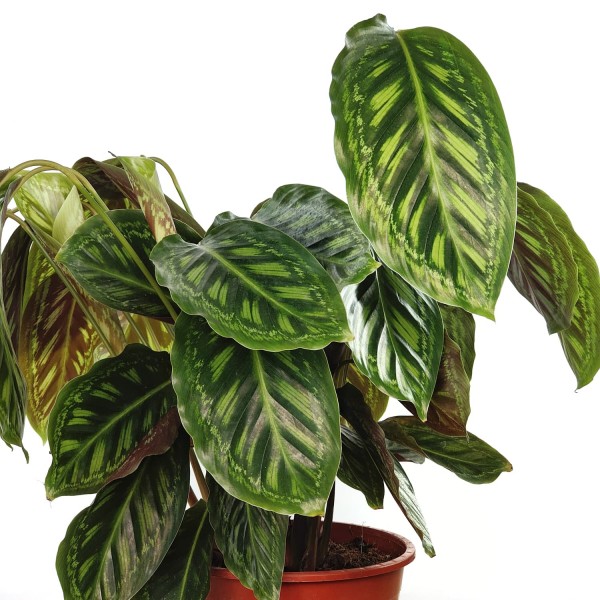 La Calathea Flamestar est une variété aux feuilles grandes et arrondies, mais plus allongées que la spectaculaire médaillon calathea, dans des tons vert clair sur la partie supérieure et très légèrement rougeâtres sur le dos des feuilles.