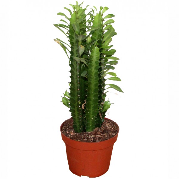 Cactus de colonne de tiges aux côtes très marquées, l'Euphorbe Trigone est une plante qui produit de petites feuilles le long des tiges, ce qui la différencie de la plupart des cactus et la rend très caractéristique. Elle pousse de manière ramifiée et forme de grands buissons. Plante qui nécessite une protection du soleil en été et du froid en hiver. Elle peut également vivre dans des intérieurs très bien éclairés. Irrigation très modérée.