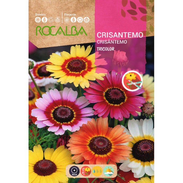 Graine de chrysanthèmes tricolores panachés (Chrysanthemum carinatum). Plante herbacée annuelle, aux fleurs très voyantes de différentes couleurs. On l'utilise en bordure de jardin et comme fleur coupée.