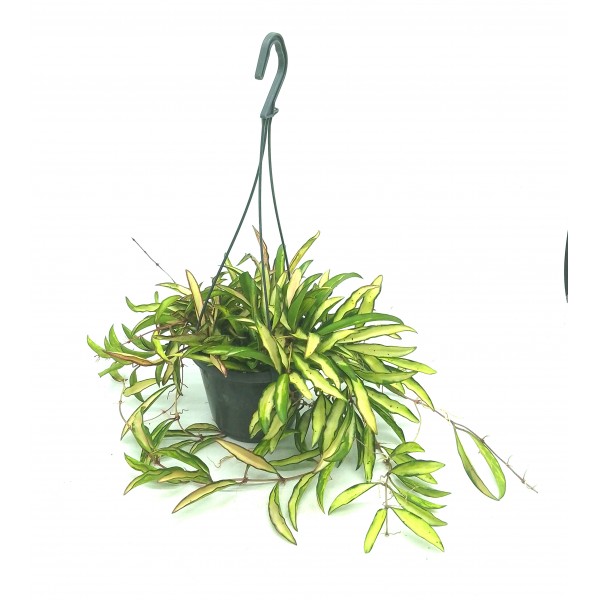 Ce Hoya Wayetii est une plante parfaite à accrocher dans des intérieurs bien éclairés, même en plein soleil. Feuilles longues et charnues, nuancées, et fleurs en grappes de fleurs étoilées légèrement roses.