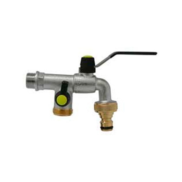 Robinet double en métal de conception et de fabrication italienne, avec adaptateur de robinet standard. Haute qualité. Particulièrement indiquée pour l'installation d'un programmateur, la clé de fermeture arrière rend le programmateur indépendant de la sortie principale.