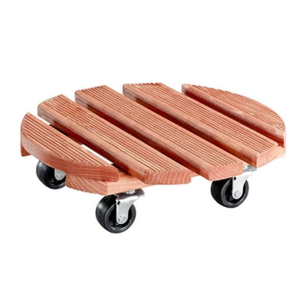 Multi rouleau ou support à roulettes pour pots, en bois traité longue durée de couleur pin, acajou ou cerisier. Support de 30 cm de diamètre.