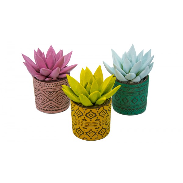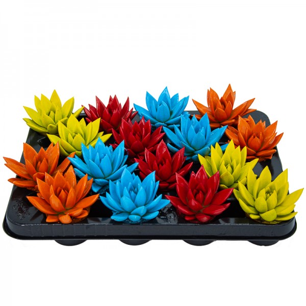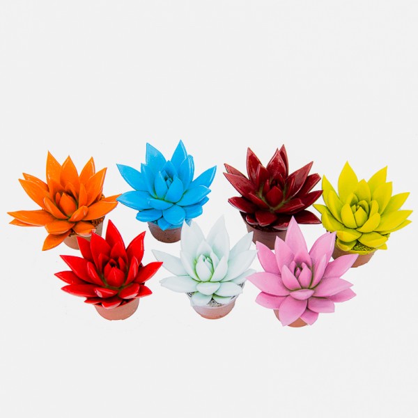 Plante grasse ou succulente originaire du continent américain, c'est une Echeveria aux feuilles épaisses et tendres, aux pointes peintes de différentes couleurs, avec une peinture spéciale pour plantes qui leur permet de réaliser parfaitement la photosynthèse.