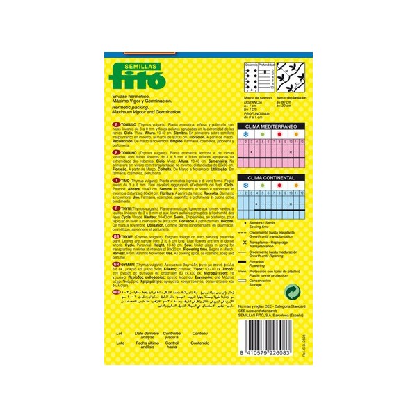 Le thym aime être relativement seul. On peut le cultiver dans les marges ensoleillées et légèrement humides du jardin, à l'écart des autres plantes aromatiques, peu gourmandes en eau comme la Sauge ou le Romarin.