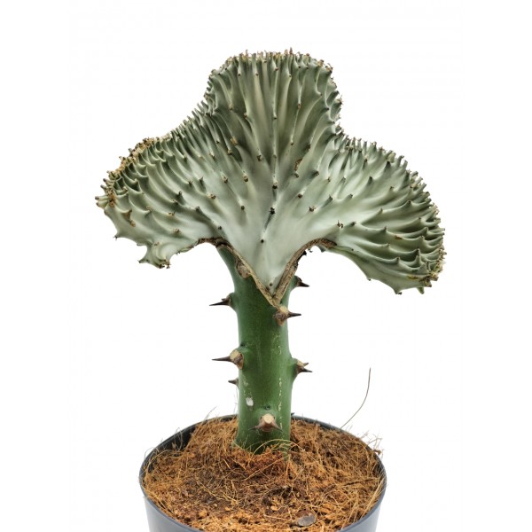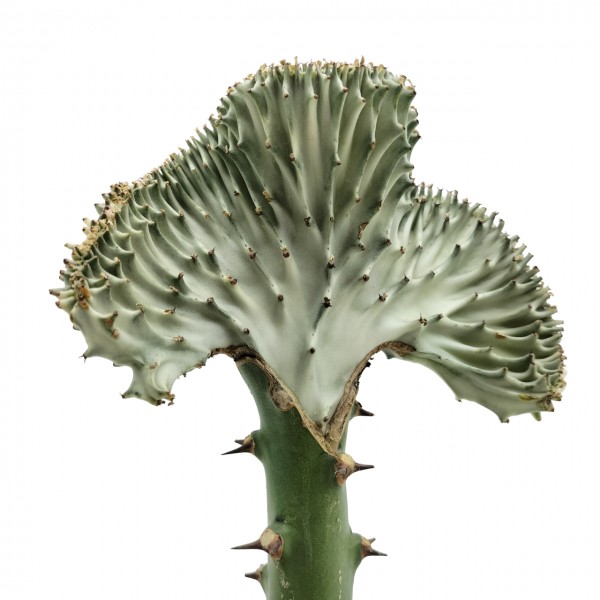 Cacto enxertado composto por 2 cactos, enxertados entre si, em que o caule é verde, e o enxerto Euphorbia lactea cristata.