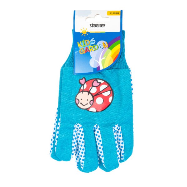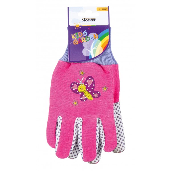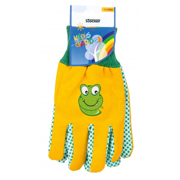 Luvas de jardim para crianças em 2 cores, amarelo e rosa, com estampado de sapo ou borboleta respectivamente. Tamanho único para as mãos da maioria das crianças. Alta resistência para uso regular.