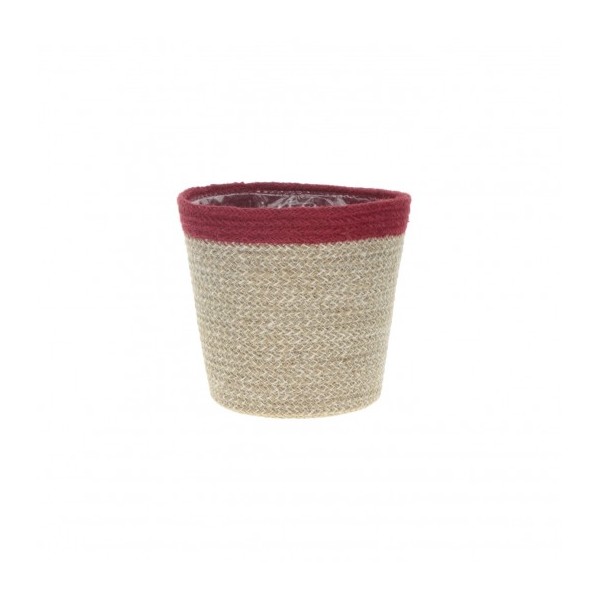 Vaso redondo de juta cilíndrico, forrado internamente em plástico para melhor rega. Decorado com listra vermelha superior