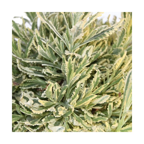 Lavanda de tamanho e crescimento, formato das folhas serrilhadas e fragrância muito semelhante à lavanda dentada, mas com folhagem matizada: suas folhas são verdes e amarelas.