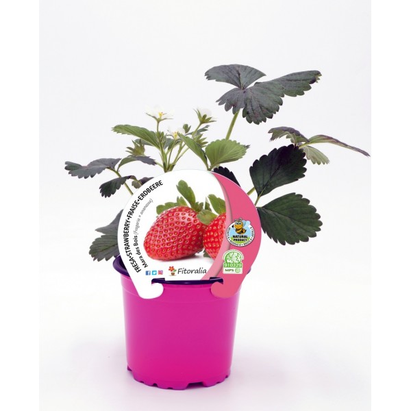 Muda de morango Mara des bois, apresentada em vaso de 10,5 cm de diâmetro.