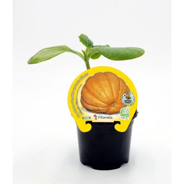 Muda de abóbora Atlantic Giant, apresentada em vaso de 10,5 cm de diâmetro.