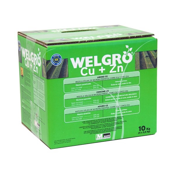 Welgro Cu + Zn é um fertilizante de aplicação foliar à base de cobre e zinco (30% respectivamente). Contém partículas micronizadas de óxido cuproso e óxido de zinco que aderem nas folhas e na superfície da planta que proporcionam uma reserva de cobre e zinco com liberação lenta, fornecendo os nutrientes necessários à planta quando esta necessita.