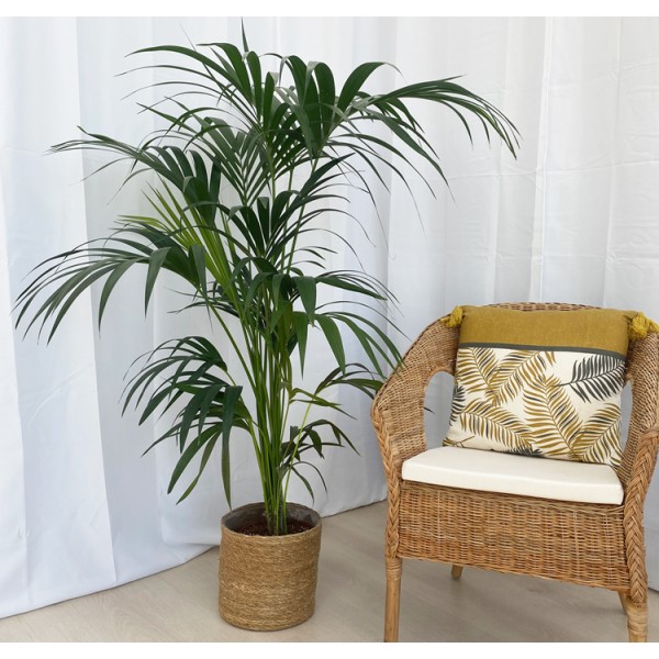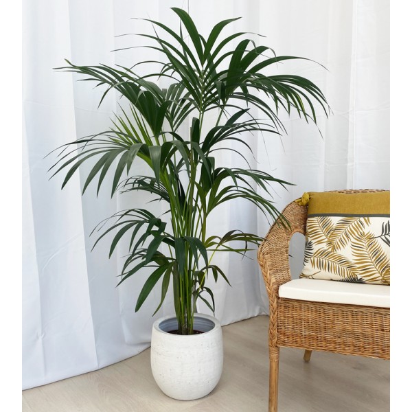 A Kentia é uma palmeira de interior muito durável e resistente. De crescimento lento, apresenta folhas largas e fibrosas, sempre com uma cor verde-escura característica. Sempre em sombra. Palmeira muito elegante, precisa de espaço para crescer à medida que as folhas caem em leque.