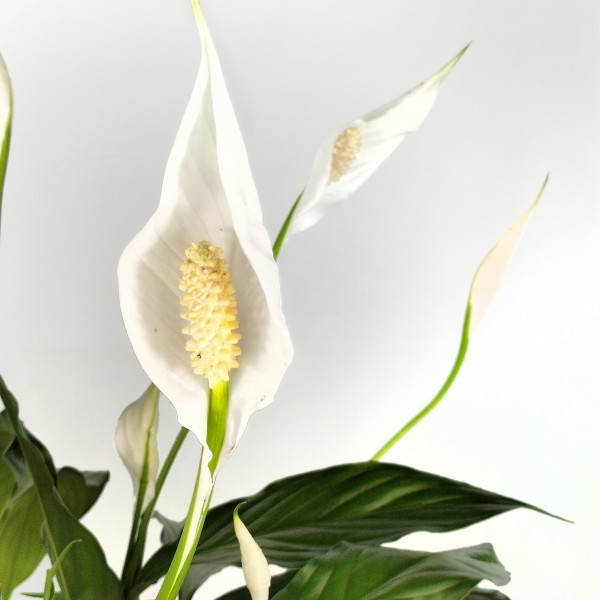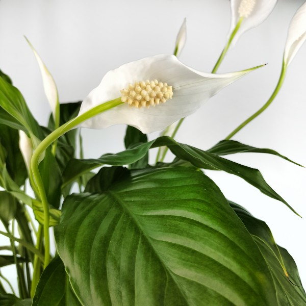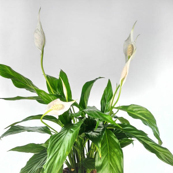 Planta de interior com folhas verdes brilhantes, muito decorativa e resistente. O spathiphyllum emite flores quase brancas que duram muito tempo, podem se adaptar a ambientes com pouca luz e precisam de muita humidade e rega. Ideal para interiores para decorar qualquer recanto da nossa casa, pois é muito fácil de manter e muito resistente a todos os tipos de ambientes interiores.