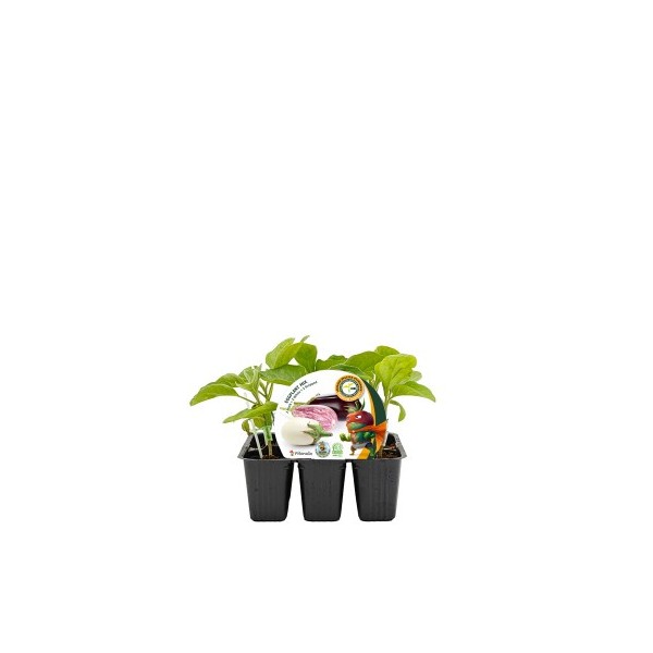 Mudas de berinjela enxertadas híbridas naturais F1 de 3 variedades diferentes, apresentadas em albeolero. Pacote de plantas híbridas e enxertadas: