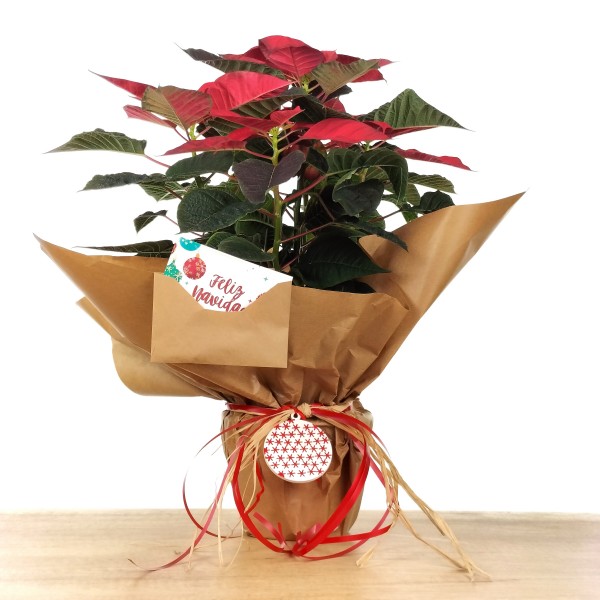 | Ponsetia embrulhada em papel kraft, amarrada com ráfia natural e fita da cor da ponsétia, com detalhe natalino. Caso seja um presente, a embalagem também traz um cartão com “Bom Natal”. Para incluir uma nota ou o remetente do presente, você encontrará um espaço para indicá-lo durante o processo de finalização da compra. |