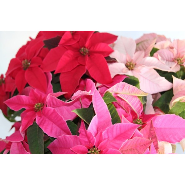 Conjunto de 3 ponsétias muito ramificadas de cores diferentes. Crie uma poinsétia mais larga e arbustiva, com cores vivas, uma proposta diferente para estas festas de Natal.