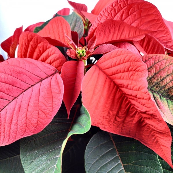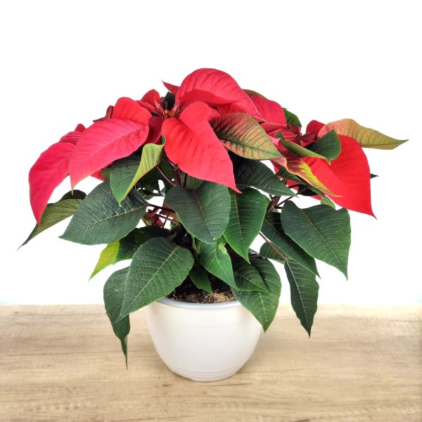 Poinsettia vermelha tradicional muito ramificada, em vaso grande. Uma poinsétia mais larga e arbustiva.